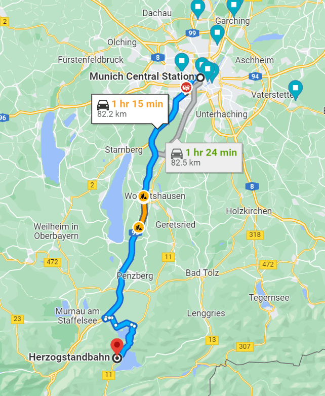Distance from Hauptbahnhof to Walchensee Herzogstandbahn is around 83 km. The car takes about 1 hour 24 minutes to complete the journey. There is available pay and park near Herzogstandbahn costing 3 Euro.