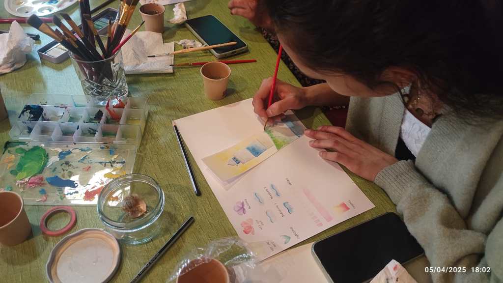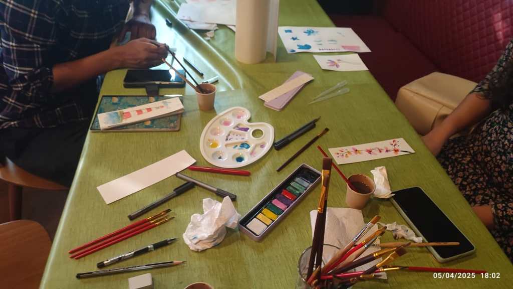 We started with a scribble warm-up, a fun way to loosen up. It helped everyone relax their hands and clear their minds. Whether someone was new to painting or had some experience, everyone was welcome. Our guide, Pranathi Narayanareddy, shared the basics of watercolor step by step. She covered blending, gradient washes, soft layering, and brush control. Along the way, she added personal tips that made learning feel easy and natural.