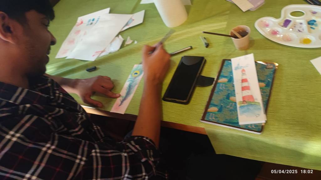 Bookmarks soon turned into unique, personal pieces of art. Some painted florals, others sketched landscapes or playful abstract shapes. A few added quotes, making each piece truly their own. It was heartwarming to see ideas being shared and celebrated. Participants encouraged each other, laughed together, and let creativity flow freely. In the end, art did what it does best — connect people.